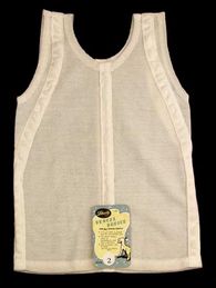 The "Liberty Bodice" was a stiff cloth garment that you put on over your head. It came down to your knees. It had no sleeves (a bit like a vest, but thicker). The top part had white rubber buttons to make it a good fit around your neck, about 5 or 6 of them.